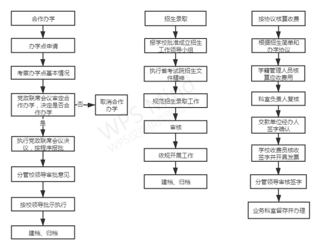 1. 办学合作协议签署前的考察、论证意见及签署; 2. 招生录取工作的依规录取; 3. 按协议核算收费 |