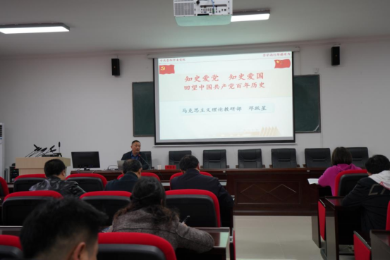 本次党课,邓跃星主任以《知史爱党、知史爱国——回望中国共产党百年历史》为题,以“开展党史教育的重大意义”引入,从“矢志初心使命的一百年、筚路蓝缕的一百年、创造辉煌成就的一百年”三个方面为到课的全体党员同志全面系统讲授了我们党的百年历史。邓主任的讲授纵横百年,时间脉络清晰,党史内容丰富,既讲授了特定党史知识,又传授如何进行党史学习的方法。
